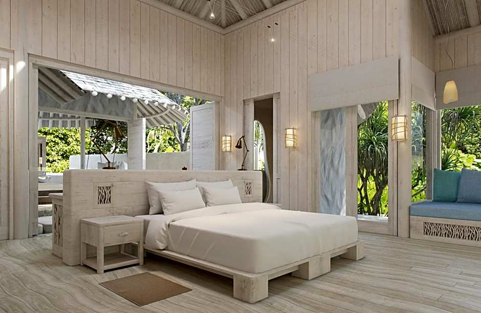 This three bedroom beachfront villa is a sprawling 1,796 sqm with not a straight line in sight and has a viewing tower crowned by a dining table, which is the highest point on the island.